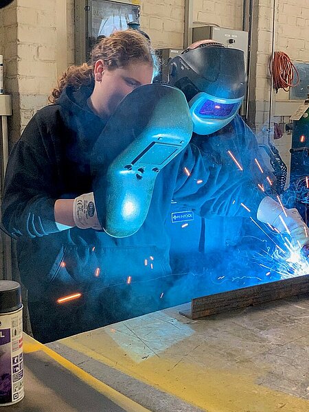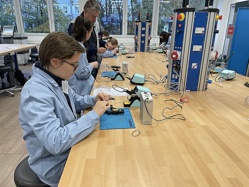 Einen spannenden Einblick in die MINT-Berufswelt bekamen die Schülerinnen dann bei den vertiefenden Praxistagen bei Feintool. Hier konnten die Schülerinnen in insgesamt fünf Abteilungen des Unternehmens praktisch den Arbeitsalltag miterleben und berufsspezifische Aufgaben kennenlernen. So lernten sie zum Beispiel, was bei einer Qualitätskontrolle zu beachten ist, wie Werkzeuge hergestellt werden, konnten sich selbst im Schweißen üben und erfahren, welche Rolle Elektronikerinnen und Elektroniker bei der Installation und Instandhaltung von Produktionsanlagen spielen.