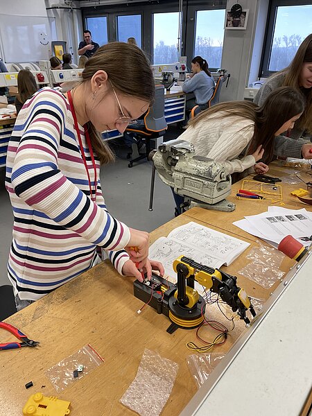 Angefangen bei dem "elektronischen Piraten", der frisch aus dem 3D-Drucker im Lötworkshop mit einer Platine und LEDs bestückt zum gruseligen Leuchten gebracht wurde, über das Grundverständnis der Informatik beim "Turing Tumble", den Einblicken ins Verpackungsdesign von Shampoo bis hin zum Aufbau eines Roboterarms, der dann in der “großen” Version als Industrieroboter Produkte automatisiert zusammenbauen kann. Aufgelockert wurde das spannende Programm durch Werkstattführungen und den Austausch mit vielen Role-Models, die aus dem eigenen Arbeitsalltag zu berichten wussten.